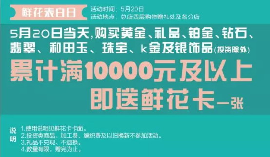 菜百首饰特为520前来选购珠宝准备表白的你助阵,累计满额即赠鲜花卡一张!注:活动详情以店内明示为准。