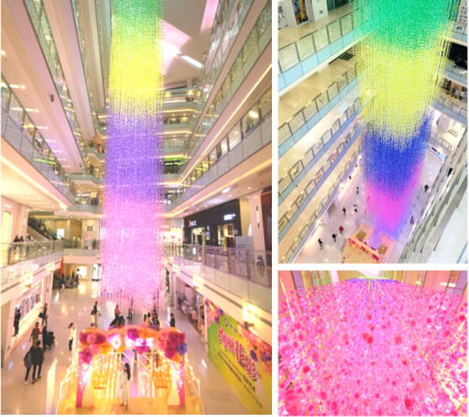 当繁花汇聚,水色天光,树形花影,这里有最好的风景,逾35米高的花影艺术装置,逾120,000朵花阵编织出串串智慧花语,从空中垂挂而下,巨型花海里,凝聚心思与视线,随着流水闪动的灯光,一陂春水绕花身,在花影灯海里,浪漫与希望交织,遇见最美的你。