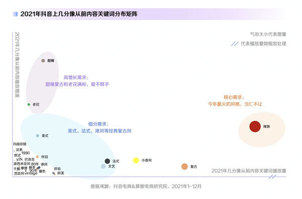 复古怀旧风格的升温,助推抖音上“几分像从前”生活方式下的相关穿搭内容频上热搜。“辣妹”“复古”“小香风”“法式”等许多定格千禧年代的流行风格,俨然成为2021年复古内容的热词,过去一年,带有“复古”相关关键词的服饰短视频播放量超过69亿次,同比增长129.3%。